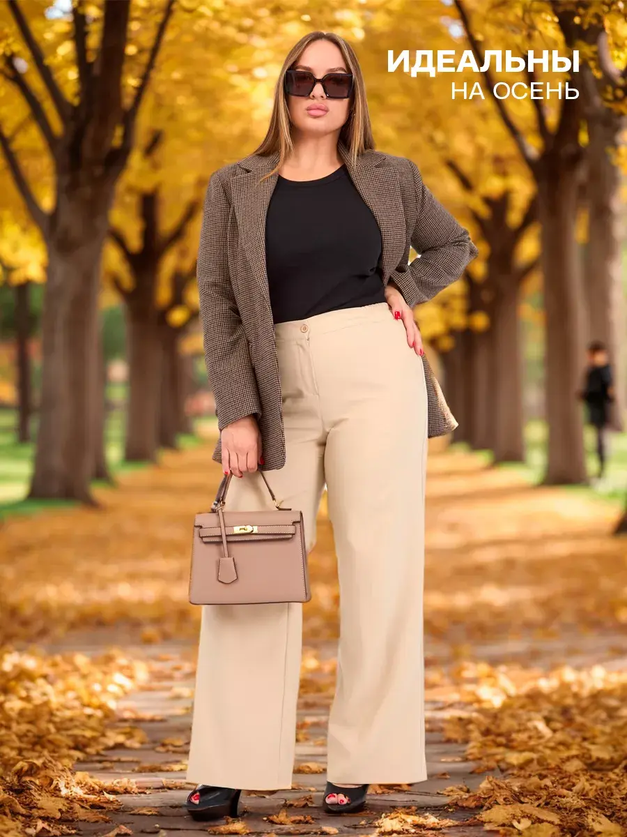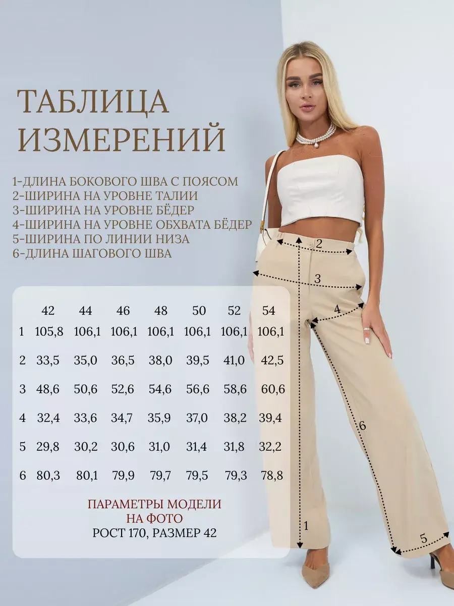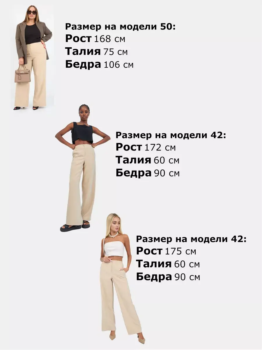 Бежевые штаны женские - идеальный выбор для летнего сезона. Эти стильные и универсальные брюки палаццо впишутся в любой гардероб. Их классический крой и широкие штанины создают элегантный образ, подходящий как для повседневных дел, так и для праздников. Бежевый цвет добавляет легкости и свежести, идеально сочетаясь с летним настроением. Вы будете чувствовать себя комфортно и стильно в этих штанах в любую погоду. Попробуйте эти летние женские брюки палаццо и оцените их удобство и красоту!