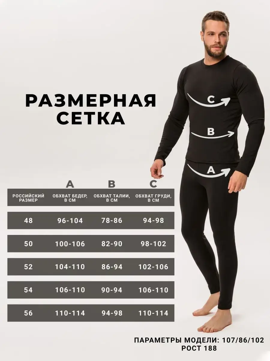 Диапазон от + 5 °С до - 30 °С. Плотность 160 г/м2. Мужской комплект термобелья от AT SPORTS - это отличный подарок на 14 и 23 февраля или день рождения который защитит от холода вашего мужа, сына, любимого человека. Наш комплект из термокальсон и термосвитера невероятно тонкий, мягкий и теплый благодаря инновационным полипропиленовым нитям, которые обладают фитильным эффектом(неспособность материала задерживать влагу) и имеют имеет антибактериальные свойства. Подштаники и свитер прекрасно отводят влагу, дышат и согревают, дарят комфорт и тепло не только зимой, но и в демисезон, осенью и весной. Мягкие плоские швы не натирают кожу, белье не колется, очень приятное и нежное к телу. Термокомплект из лонгслива (футболка с длинным рукавом) и кальсон - удобный базовый термокостюм, идеален как первый слой под флис при низкой активности, для прогулок, тюбинга, активного отдыха. Влагоотводящее, функциональное, дышащее термо белье прекрасно подойдет под лыжный костюм, комбинезон, для сноубординга, фигурного катания, беговых тренировок, занятий футболом в холодное время года. Проверенный вариант для тренера по горным и беговым лыжам, хоккею, лыжникам и спортсменам зимних видов спорта. Утепленный костюм штаны и свитшот рекомендуем взять в командировку, использовать при работе на свежем воздухе или в холодных условиях. Можно носить раздельно верх и низ, при необходимости. Тренировочный костюм кофта и брюки - нательное спортивное термобелье для хоккея, сноуборда, футбола, бега, занятий и катания на коньках, горных и беговых лыжах. Охота, туризм, походы, рыбалка, восхождения, альпинизм, военные сборы, мотоспорт - варианты, где необходима тактическая термоодежда для мужчин и подростков. Автомобилистам просто необходимо иметь такой комплект в багажнике автомобиля, на случай непредвиденных ситуаций на дороге, особенно в зимнее холодное время. Крупные мужчины по достоинству оценят наличие больших размеров до 56 включительно.