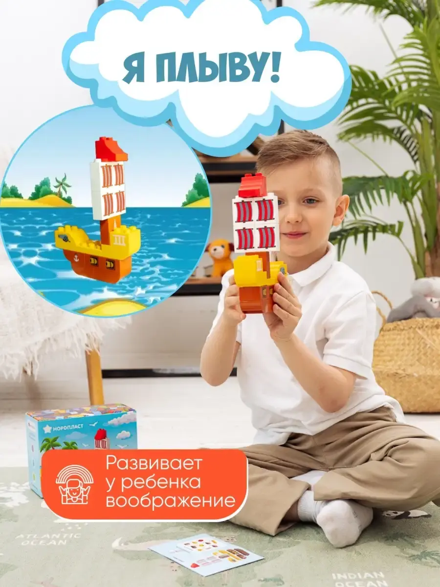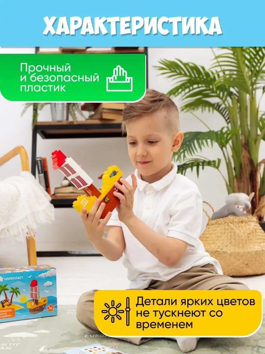 Детский развивающий конструктор Поезд для мальчиков и девочек из серии Играй, Создавай, Изучай подарит детям много ярких впечатлений и эмоций. Современный комплект состоит из 43 деталей - кубиков с цифрами и знаками и основы - вагончиков на колесиках. Блоки для моделирования в ярких цветах не тускнеют со временем и выполнены из качественного материала - прочного безопасного пластика. Крупные пластмассовые детали игрушки совместимы с лего дупло. Прикольная развивашка способствует развитию мелкой моторики, творческого и пространственного мышления, воображения, логики, цветовосприятия, внимания, позволяет в игровом формате изучать цифры, счет, простые математические действия, азы арифметики. Оригинальный конструктор позволит ребенку почувствовать себя строителем, своими руками создать необычный сборный поезд и подойдет для веселого совместного времяпровождения детей и взрослых. Набор, аналог Lego Duplo, без мелких элементов идеально подойдет для малышей в возрасте от 1 годика до 5 лет. В ассортименте представлено 5 вариантов забавного конструктора: "Поезд" - 43 детали; "Пиратский корабль" - 14 деталей; "Маяк и исследовательское судно" - 35 деталей; "Домики" - 57 деталей.; "Полицейский участок" - 17 деталей. С ним можно играть дома, взять в детский садик или с собой на дачу. Фигурки для создания паровоза можно комбинировать по-разному, чтобы учиться складывать и вычитать цифры, а также создавать различные цветные комбинации игрушки. Интеллектуальный объемный конструктор подойдет для одиночного развлечения или веселой детской компании. При необходимости детали легко чистить от загрязнений - достаточно просто их помыть водой или обработать антисептическими средствами. Большой конструктор имеет российское производство и изготавливается в Санкт-Петербурге из первичного сырья. Пластик не имеет неприятного запаха. Новогодний, подарочный, интересный набор конструктора для творчества - это лучший вариант подарка ребенку на любой праздник.
