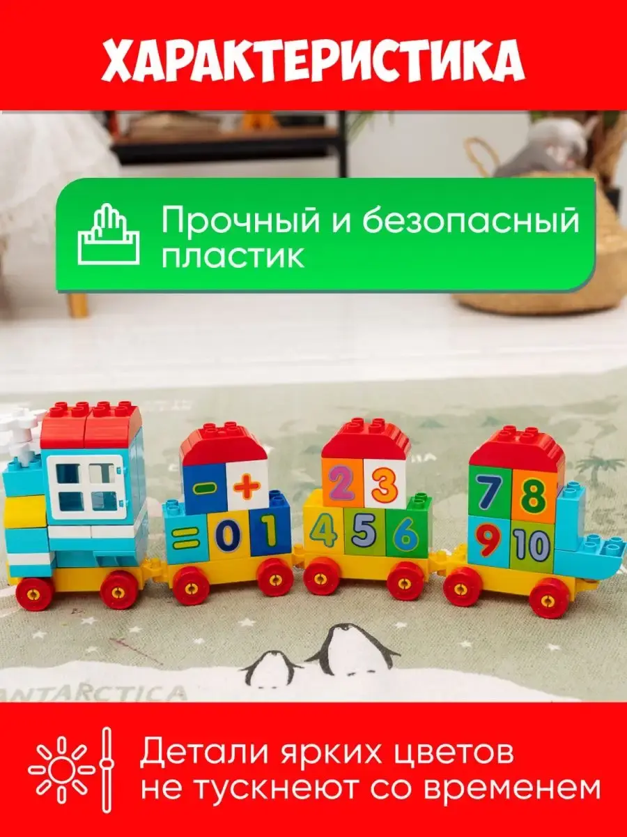 Детский развивающий конструктор Поезд для мальчиков и девочек из серии Играй, Создавай, Изучай подарит детям много ярких впечатлений и эмоций. Современный комплект состоит из 43 деталей - кубиков с цифрами и знаками и основы - вагончиков на колесиках. Блоки для моделирования в ярких цветах не тускнеют со временем и выполнены из качественного материала - прочного безопасного пластика. Крупные пластмассовые детали игрушки совместимы с лэго дупло. Прикольная развивашка способствует развитию мелкой моторики, творческого и пространственного мышления, воображения, логики, цветовосприятия, внимания, позволяет в игровом формате изучать цифры, счет, простые математические действия, азы арифметики. Оригинальный конструктор позволит ребенку почувствовать себя строителем, своими руками создать необычный сборный поезд и подойдет для веселого совместного времяпровождения детей и взрослых. Набор без мелких элементов идеально подойдет для малышей в возрасте от 1 годика до 5 лет. В ассортименте представлено 5 вариантов забавного конструктора: "Поезд" - 43 детали; "Пиратский корабль" - 14 деталей; "Маяк и исследовательское судно" - 35 деталей; "Домики" - 57 деталей.; "Полицейский участок" - 17 деталей. С ним можно играть дома, взять в детский садик или с собой на дачу. Фигурки для создания паровоза можно комбинировать по-разному, чтобы учиться складывать и вычитать цифры, а также создавать различные цветные комбинации игрушки. Интеллектуальный объемный конструктор подойдет для одиночного развлечения или веселой детской компании. При необходимости детали легко чистить от загрязнений - достаточно просто их помыть водой или обработать антисептическими средствами. Большой конструктор имеет российское производство и изготавливается в Санкт-Петербурге из первичного сырья. Пластик не имеет неприятного запаха. Новогодний, подарочный, интересный набор конструктора для творчества - это лучший вариант подарка ребенку на любой праздник.