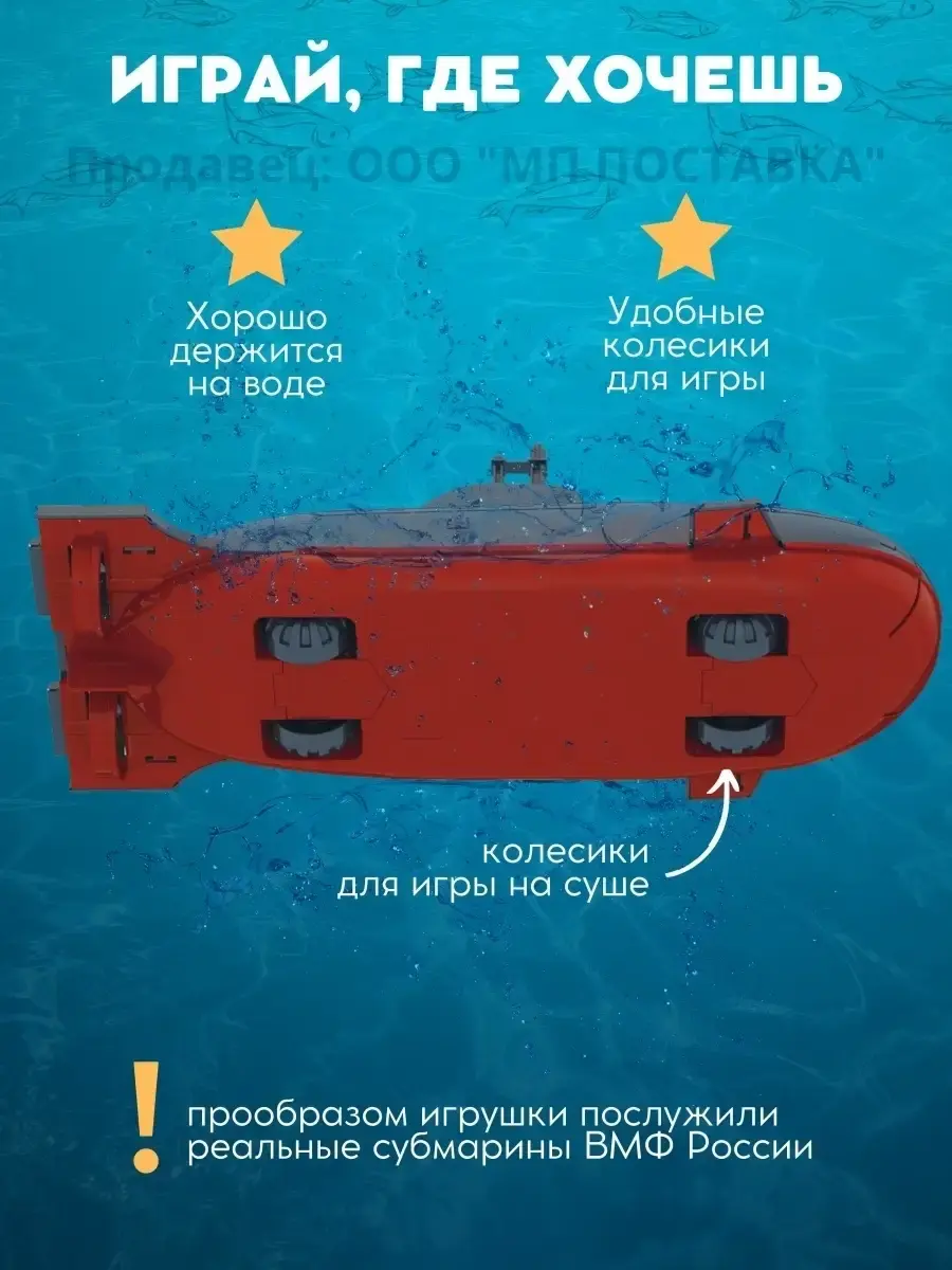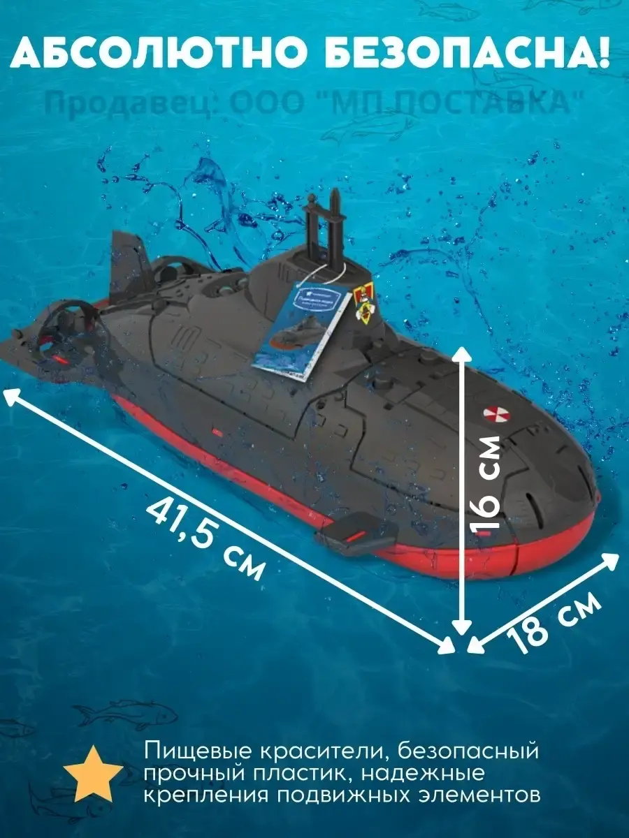 Подводная лодка похожа на настоящий военный корабль. Высокая степень деталировки, прообразом лодки послужили реальные субмарины ВМФ России. Стреляет торпедами. Устраивайте настоящие баталии при помощи мишеней в комплекте. Играйте с ней в ванной или на полу. Катер хорошо плавает в воде, также оборудован колесиками и может кататься по полу. У лодки открывается отсек, где хранятся мишени и торпеды, крышка торпедных аппаратов открывается и превращается в прицел, перископ поднимается, как у настоящей подводной лодки. Достоинствами катера являются: пищевые красители, безопасный прочный пластик, надежные крепления подвижных элементов. В комплект входит подводная лодка с 3 мишенями и 2 торпедами.