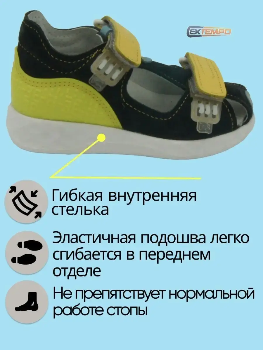 Детские сандалии для мальчиков отличный вариант обуви для ежедневной носки. Материал сандалий для подростков выполнен из натуральной кожи. Сандали с жестким задником, надежно фиксируют пятку малыша. Съемные анатомические стельки на лето подарят комфорт маленьким детским ножкам. Тонкий упругий материал в переднем отделе не позволяет стельке сминаться, занимает минимальное место в обуви, не препятствует сгибанию стопы (в пределах нормативов), облегчает движение в фазе отталкивания за счет упругости. Босоножки детские для детей летние для прогулки, детского сада. В подарок к сандаликам идет комплект сменных ремешков быстрого шнурования Extempo E-Jo!n. Система быстрого шнурования Extempo E-Jo!n позволяет Вам менять самостоятельно ремешки. Создавать свой дизайн, своё настроение