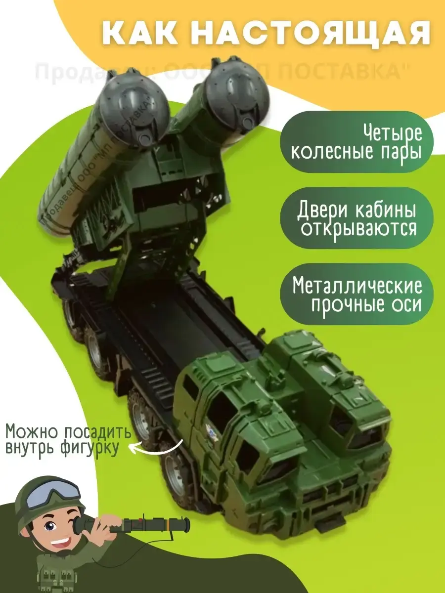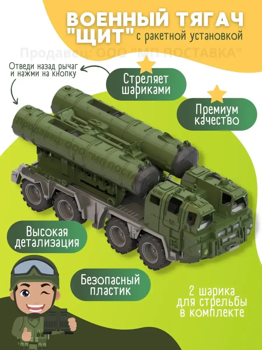 Ракетная установка "Щит": Военная машина оснащена подъемным фиксирующимся механизмом ракетной установки. Две ракетницы стреляют как по отдельности, так и одновременно с помощью спусковых крючков. В качестве снарядов для стрельбы подойдут шарики для настольного тенниса. Два таких шарика входят в комплект установки. Защитные люки, закрывающие стволы ракетниц, обеспечат удобную транспортировку машины ребенком. Каждый тягач оснащен двумя кабинами, на открывающихся дверцах нанесен рисунок, тягачи на четырех колесных парах на металлических осях.